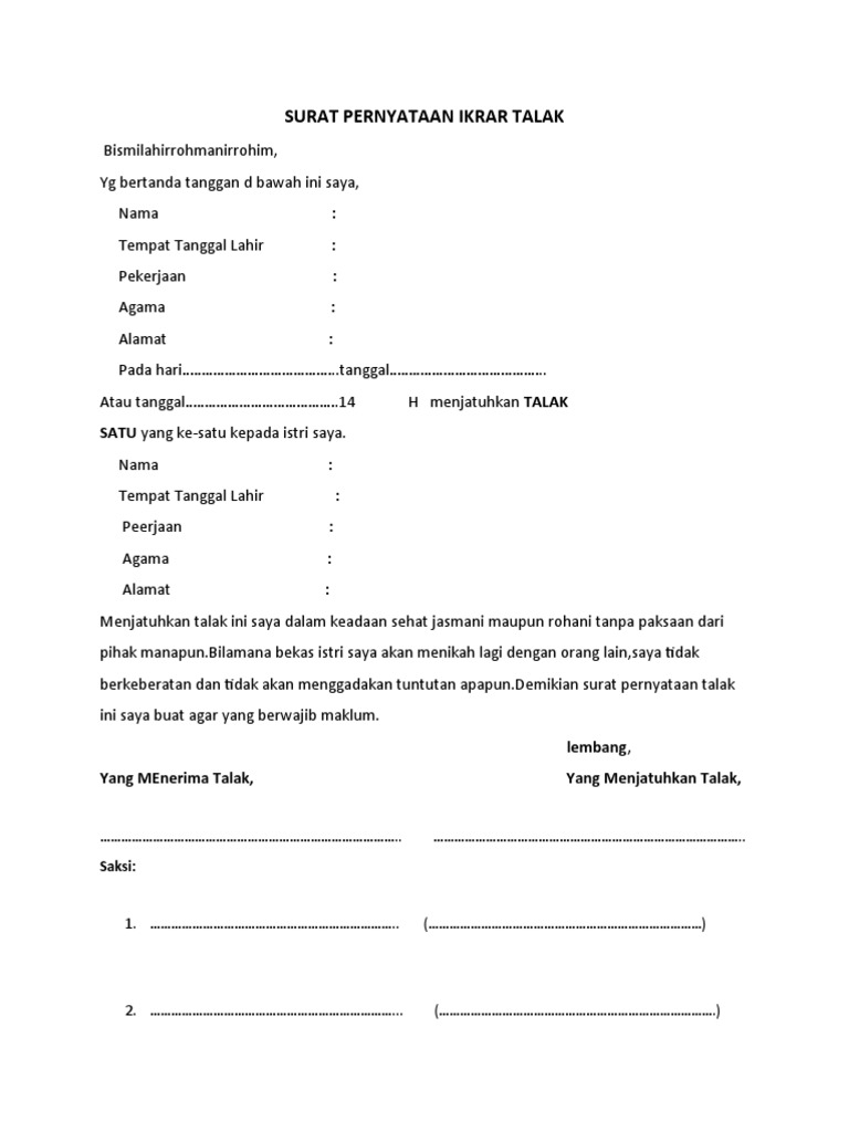 Namun dalam aturan administrasi warga negara, tentu harus melalui prosedur yang berlaku. Di dalamnya biasanya terdapat nama tempat dan tanggal lahir usia alamat dan sebagainya. Surat pernyataan ikrar talak saya yang bertanda tangan di bawah ini pihak pertama nama : Contoh surat pernyataan ikrar wakaf. Surat pernyataan talak / cerai.
